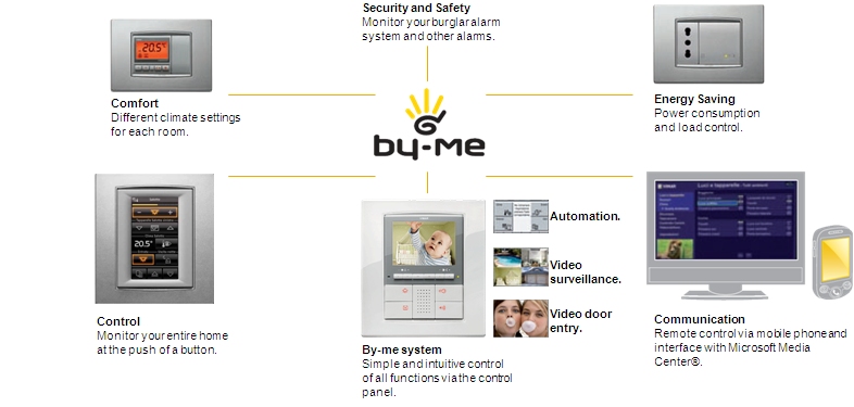Where can I control it from?All over the house, in three ways: touching a button, pressing a remote control or from the touch screen. Or from a mobile phone, wherever you may be. By-me will always be active and watchful, to ensure you of comfort, safety and peace of mind.