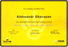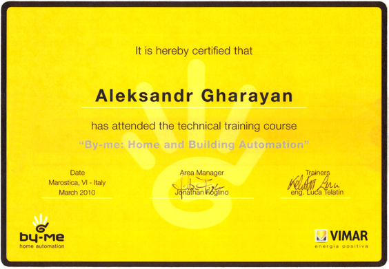 State Licenses Permitting Design of Documents and Construction in Energy Industry FieldVIMAR By-Me Home and Building Automation Training Course Certificates